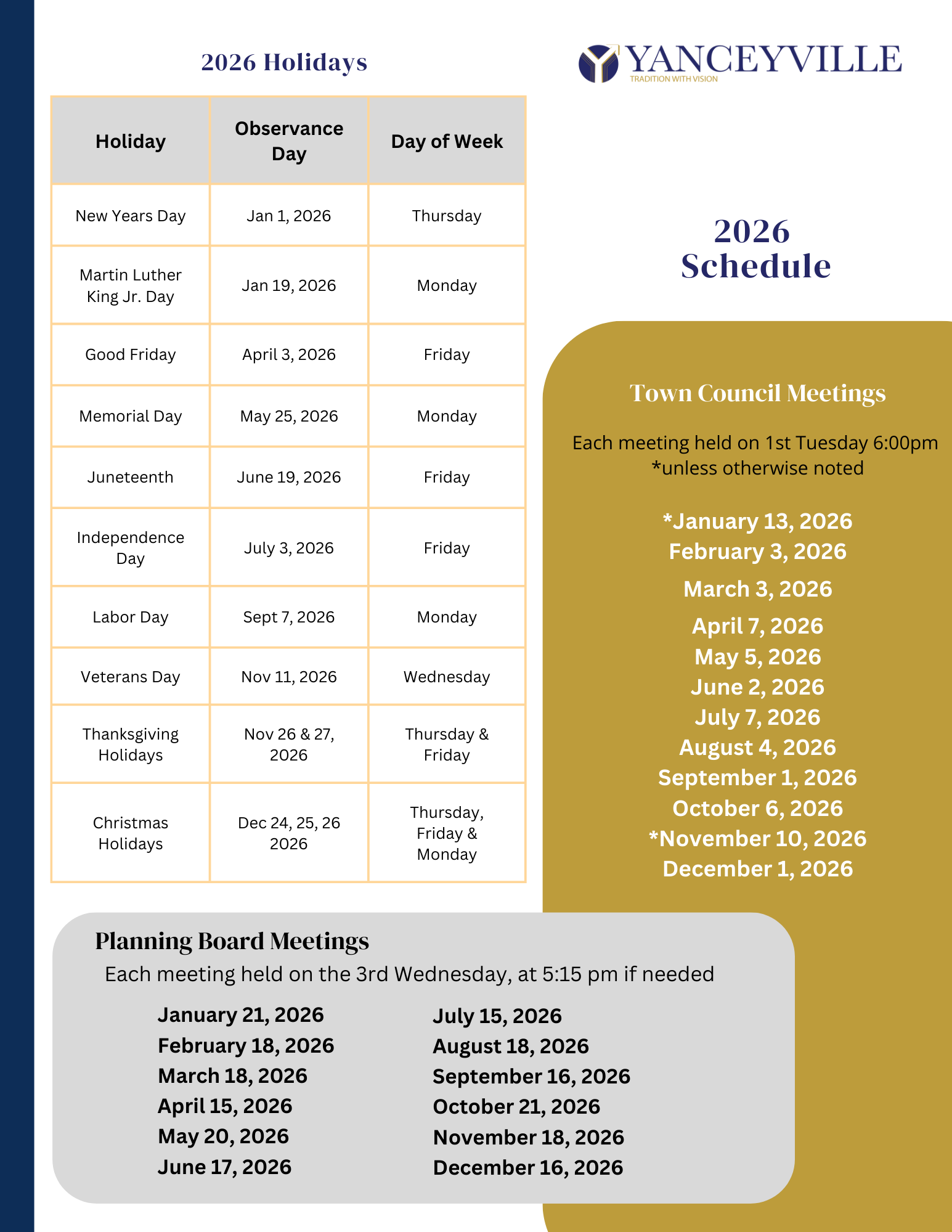 The mission of the Town of Yanceyville is to provide its citizens and visitors a clean, safe, hometown atmosphere that anyone would be proud to call home. Yanceyville will strive to prepare and build for the future, while at the same time maintaining and preserving our deep-rooted heritage that has been an important part of this community for over two -hundred years.