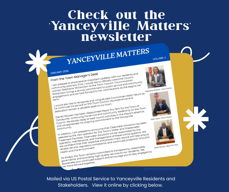 The mission of the Town of Yanceyville is to provide its citizens and visitors a clean, safe, hometown atmosphere that anyone would be proud to call home. Yanceyville will strive to prepare and build for the future, while at the same time maintaining and preserving our deep-rooted heritage that has been an important part of this community for over two -hundred years.