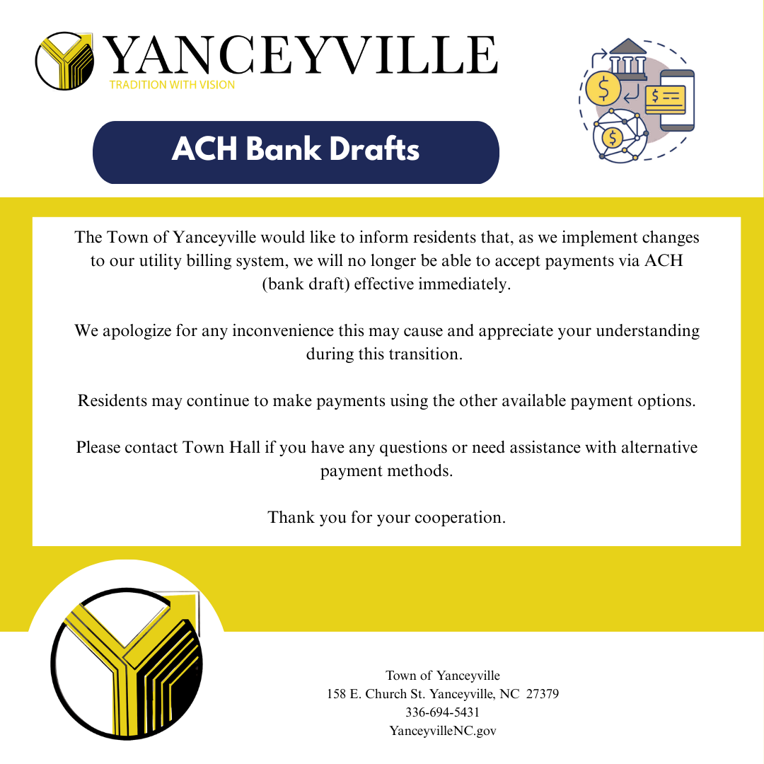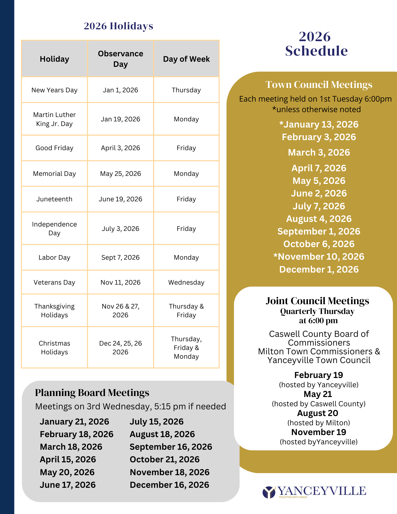 The mission of the Town of Yanceyville is to provide its citizens and visitors a clean, safe, hometown atmosphere that anyone would be proud to call home. Yanceyville will strive to prepare and build for the future, while at the same time maintaining and preserving our deep-rooted heritage that has been an important part of this community for over two -hundred years.